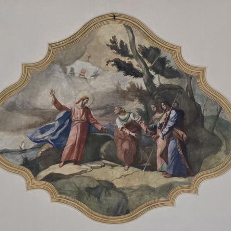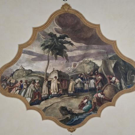 Das Deckenbild im Rohrdorfer Langhaus zeigt die Wiederauffindung der Gebeine des hl. Jakobus und seine Übertragung nach Santiago de Compostela.