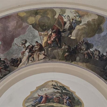 Das Deckengemälde zeigt die Schlacht von Clavijo 844 indem der Märtyrer Jakobus dem Spanischen König bei der Schlachte gegen die Mauren beigestanden haben soll. Wobei die südliche Hälfte des Gemäldes Bezug auf den 1. Weltkrieg genommen wird und so auf Jakobus Rolle als Schlachtenhelfer hingewiesen wird.