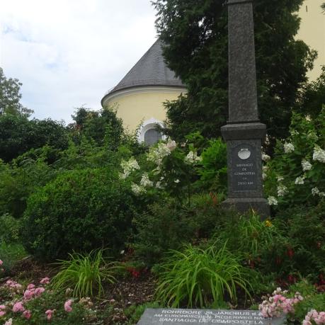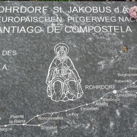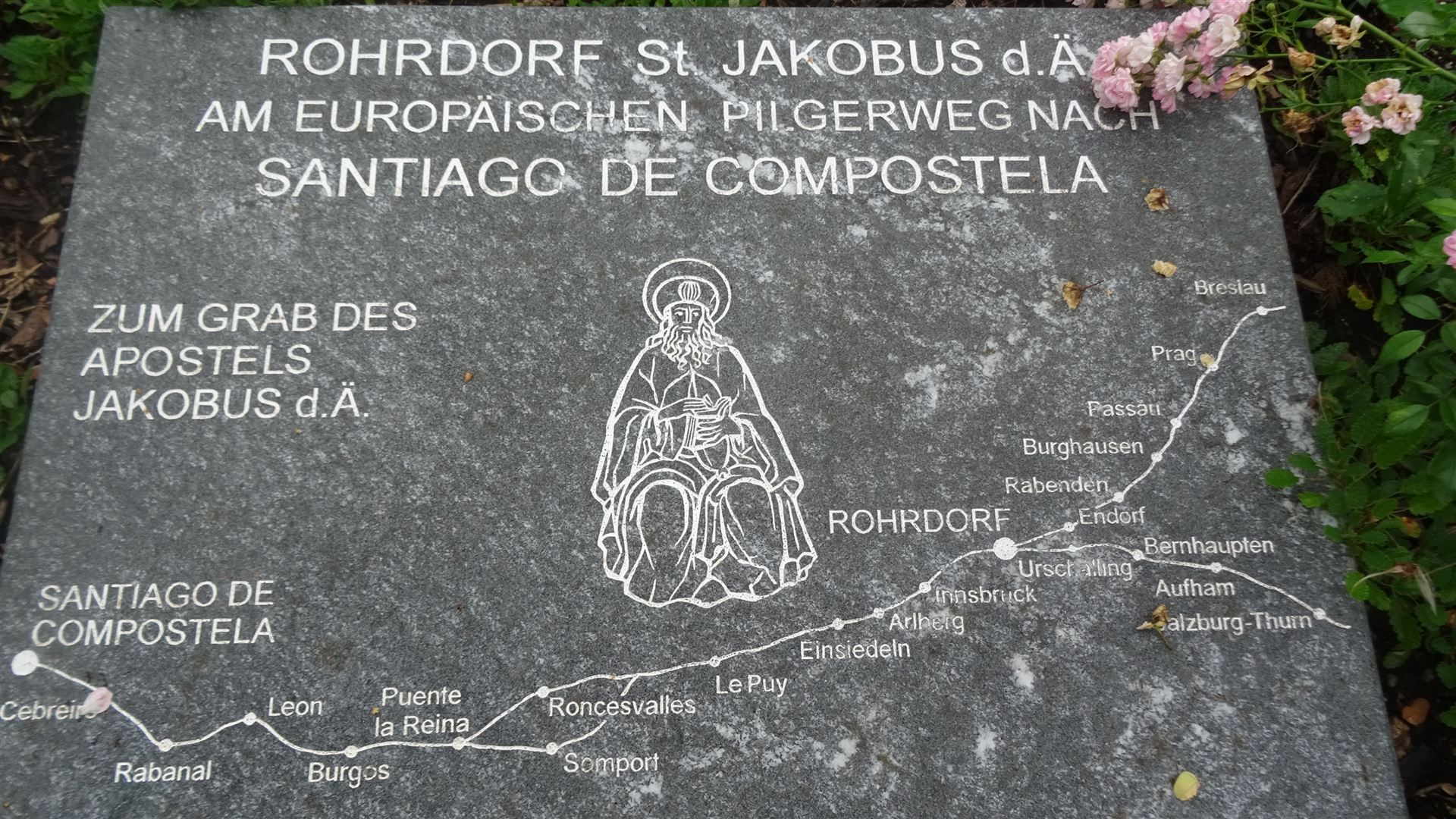Die Pilgertafel zeigt den Süd-Ost Bayerischen Jakobsweg an dem Rohrdorf liegt und eine Anlaufstelle für Pilger ist.